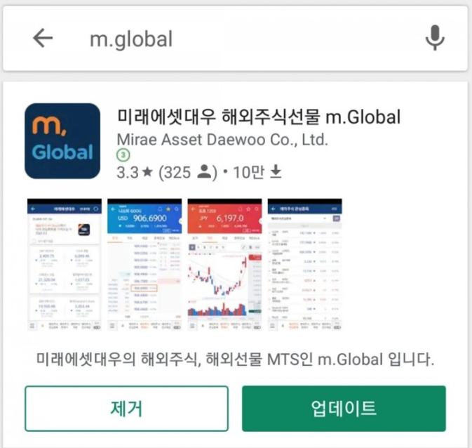 안드로이드 마켓에 접속해서 미래에셋대우 해외주식 선물을 다운 받습니다.