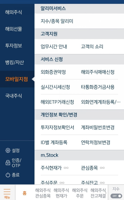 메뉴->모바일지점->외환증권약정과 해외주식매매 신청