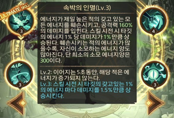 또한 추가적으로 Lv2부터는 5초 동안 해당 적의 에너지가 증가되지 않기 때문에 에너지를 전문적으로 뺏는 스킬로 보시면 됩니다.
