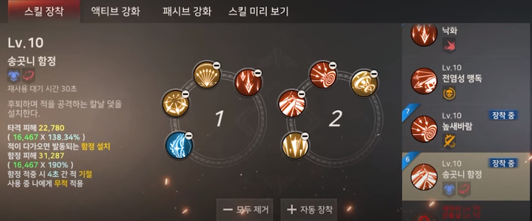 그 다음은 낙화 / 신기루 / 송곳니 함정 혹은 회피기가 있는 스킬을 올리실 것을 추천드립니다.